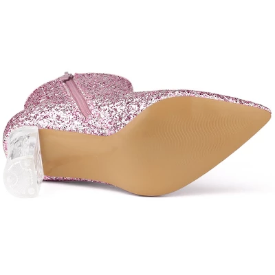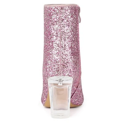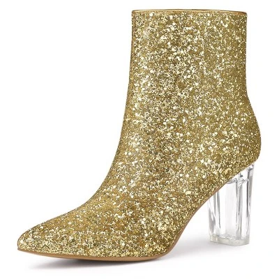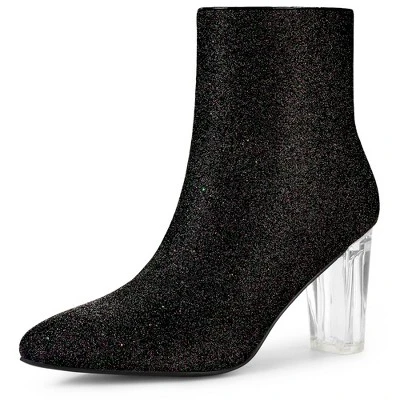 - Glitter Ankle Booties, Clear Heel, Block Heel, Zip Closure