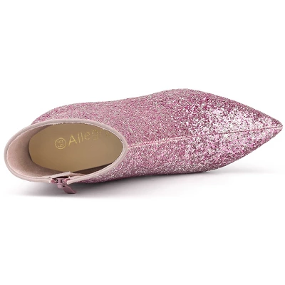 Can’t help falling in love with these sparkly booties. The Glitter Ankle Boots have high block heels, a pointed toe, a low shaft that zips up the inside, and a safe cover on the mouth of shoes to prevent rubbing from the glitter. They will win your heart via your feet. Vamp: Glitter; Outsole: Rubber; Heel: ABS. Heel Height: 3 1/3 inches. Shaft Height: 4 8/9 inches.