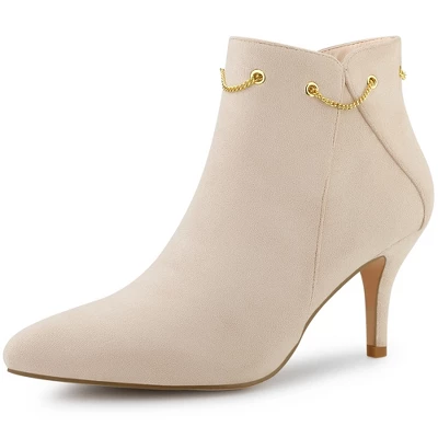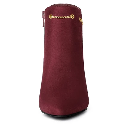 Step back in retro times with these stiletto booties. They are the perfect addition to your footwear collection. Pair them with skinny jeans or a mid-length skirt for an ultra retro-chic look. The classic design and the small chain accessories add a lively temperament. The pointed-toe design is classic and never out of date. These closed-toe ankle booties will keep your feet warm on winter days. The side zipper helps you wear them easily. Please check your size before ordering.