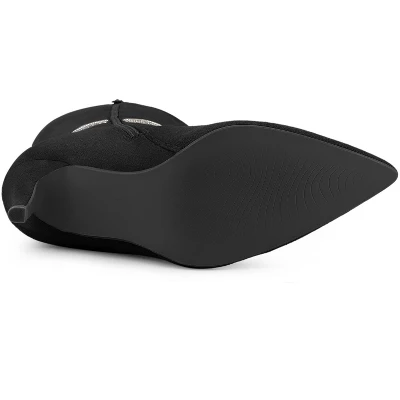 The crystal chain dazzles against the faux suede of this elegant pointy-toe knee-high boot elevated by a stiletto heel. The knotted crystal chain adds a different style to these basic high boots, suitable for fashionable women to wear in different scenes, such as parties, graduation ceremonies, daily wear, dating, etc. Rhinestones Decor Knee High Boots; Pointed Toe; Stiletto Heeled; Knot Crystal Chain; Vamp: Faux Suede; Outsole: Rubber; Heel: ABS; Heel Height: 3 3/4 inches.
