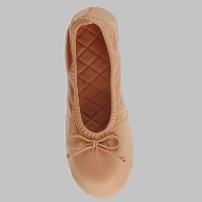 An Isotoner classic in the buff! All new skin-tone inclusive nude slipper for every shade of you. The iconic ballerina style fits like a sock but wears like a slipper, with recycled stretch satin uppers that surround your feet in ultimate comfort and memory foam soles form perfectly to your feet. Great for travel, relaxing at home, and wedding parties. Care instructions: Machine wash in cool water, dry flat away from heat.