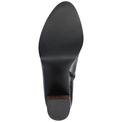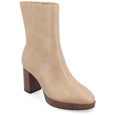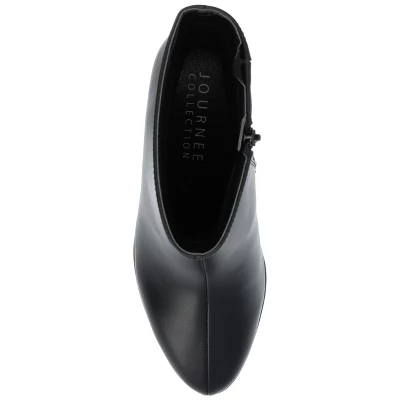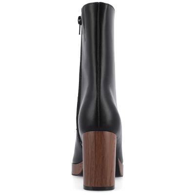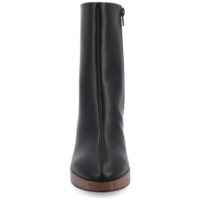 Get a stylish look for any occasion with these trendy Romer booties from Journee Collection. The luxe vegan leather looks and feels great with any outfit you throw on, and the faux wood platform and block heel give them a cool touch. They’re super fashionable with a center seam detail and an almond toe. These booties have a 10 1/2-inch top circumference and a comfy 4 mm Tru Comfort Foam™ insole. Putting them on is a breeze with the inside zipper