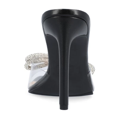 The Fenella heels from Journee Collection will give you style and comfort all in one with their 4 mm Tru comfort Foamâ„¢ insole, lucite material, and open toe. As a bonus, their stiletto heel, slip-on silhouette make them the perfect formal yet easy heel for special occasions. Rhinestone details top the look for a show-stopping finish.