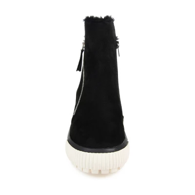 Sporty and practical, the Jessy by Journee Collection is a round-toe vegan leather boot detailed with zippers at the sides for a modern touch and smooth entry. Soft faux-fur trim keeps you warm while you are out and about in the cold. A thick treaded sole and a 4 mm Tru Comfort Foam™ footbed finishes this cozy loungy look. At Journee Collection, our booties will give you that comfortable yet stylish look, perfect for when you’re in the office all the way to a fun night out with the girls.