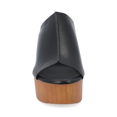 The Lorenza faux wood platform sandals from Journee Collection are the perfect shoe to take you from work to a nice evening out to dinner with their open round toe. Having been made from luxe vegan leather and center seam detail, it will make them a simple yet classy sandal, giving you the perfect combination of not overdressed but not underdressed. As a bonus, their 4 mm Tru Comfort Foamâ„¢ insole, slip-on closure, and clog design will make them one of the most comfortable pairs of shoes that you will ever wear.