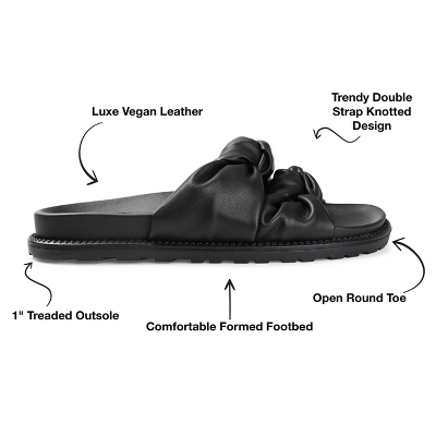 You’ll look oh-so-cool at the pool or beach Melanie by Journee Collection. With a comfy padded footbed and soft vegan leather, this sporty slide fits like a dream. Puffed straps with knot details top the look. At Journee Collection, our sandal styles are going to be perfect for any occasion. Whether that be a formal, business, or casual dress, these sandals will be a perfect match.