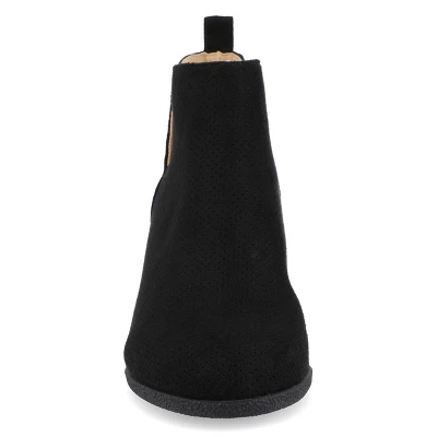 Introducing the Mylee wide-width bootie by Journee Collection. These comfy pull-on boots are perfect for the fall. Made of vegan leather with perforated details and side cutouts, they feature a padded insole and round-toe, and sit atop a stylish wedge heel. These basic and versatile boots are a must-have for any wardrobe.