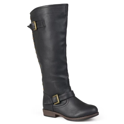 Set the trend this season in studded riding boots by Journee Collection. These chic boots feature premium faux leather uppers that rise to a knee height and feature a back zipper with stud detail. This boot is also available in a wide-calf boot style. At Journee Collection our boot styles will have your outfit looking even better than before. They will give you that finishing touch that will have your outfit looking straight out of a magazine.