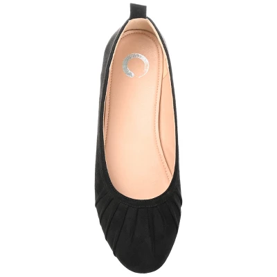 Darling details define the Tannya flat by Journee Collection. These versatile ballet flats feature vegan leather materials sitting on a 4 mm Tru Comfort Foam� insole for extra comfortable wear. Classic round toes and a contemporary ruched design at the top finish this eye-catching style that looks great dressed up or down. At Journee Collection our flat styles will have you looking just as professional as the boss at work to having the cutest shoes when you go out for the night.