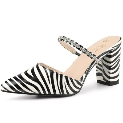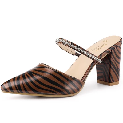 - [ FEATURES ]: Chunky Heels; Pointed Toe; Printing; Slip on Mules; Rhinestone Decor; Lightly Padded