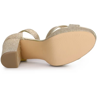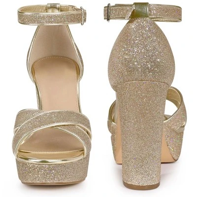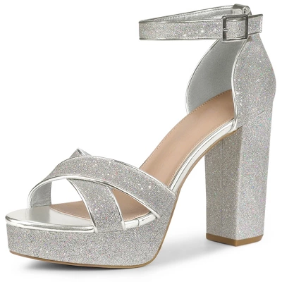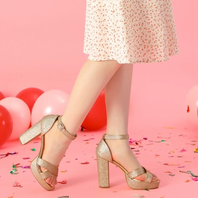 - Open Toe, Crisscross Strap, Block High Heels, Glitter Upper, Buckle Closure, Platform Heels Sandals