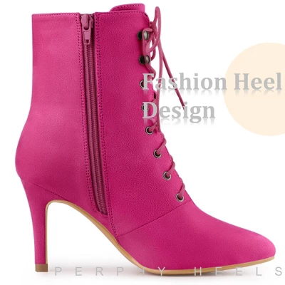 Cute and comfy faux-suede pointed-toe ankle bootie! Lace-up and stiletto heels for everyday wear, great with jeans and dresses! Lace Up Ankle Boots; Side Zipper Closure; Pointed Toe; Padded insole cushions your foot as you walk. The slip-resistant rubber sole has a special traction grip that will keep you on your feet on slippery floors.